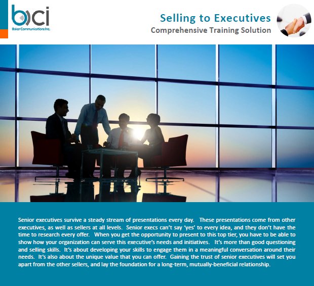 Senior executives survive a steady stream of presentations everyday. These presentations come from other executives, as well as sellers at all levels. Senior execs can’t say ‘yes’ to every idea, and they don’t have the time to research every offer. When you get the opportunity to present to this top tier, you have to be able to show how your organization can serve this executive’s needs and initiatives. It’s more than good questioning and selling skills. It’s about developing your skills to engage them in a meaningful conversation around their needs. It’s also about the unique value that you can offer. Gaining the trust of senior executives will set you apart from the other sellers, and lay the foundation for a long-term, mutually-beneficial relationship.