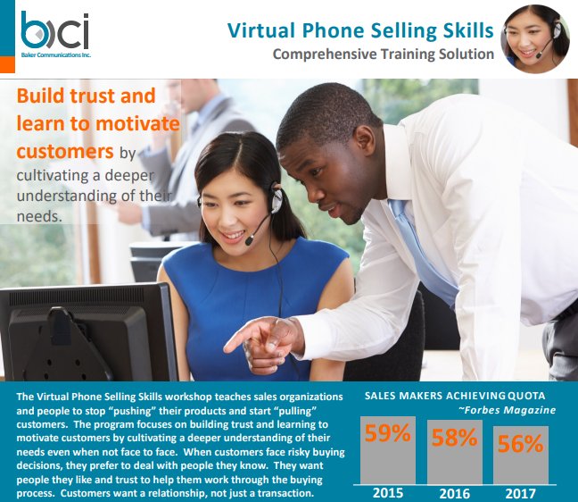 The Virtual Phone Selling Skills workshop teaches sales organizations and people to stop “pushing” their products and start “pulling” customers. The program focuses on building trust and learning to motivate customers by cultivating a deeper understanding of their needs even when not face to face. When customers face risky buying decisions, they prefer to deal with people they know. They want people they like and trust to help them work through the buying process. Customers want a relationship, not just a transaction.